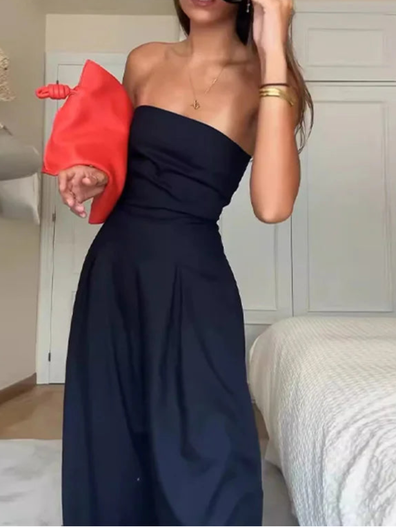 Met haar strapless ontwerp en open rug straalt ze zelfvertrouwen en vrouwelijkheid uit 💖 terwijl de hoge taille en wijde pijpen zorgen voor een flatterende, comfortabele pasvorm.